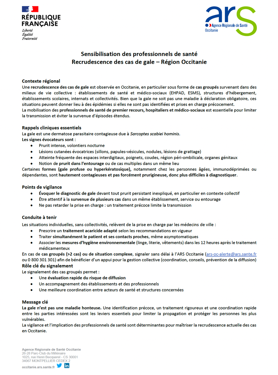 Une recrudescence des cas de gale est actuellement observée en région Occitanie, avec la survenue de cas groupés en contextes de vie collective (établissements sanitaires et médico-sociaux, structures d’hébergement, établissements scolaires, collectivités).
